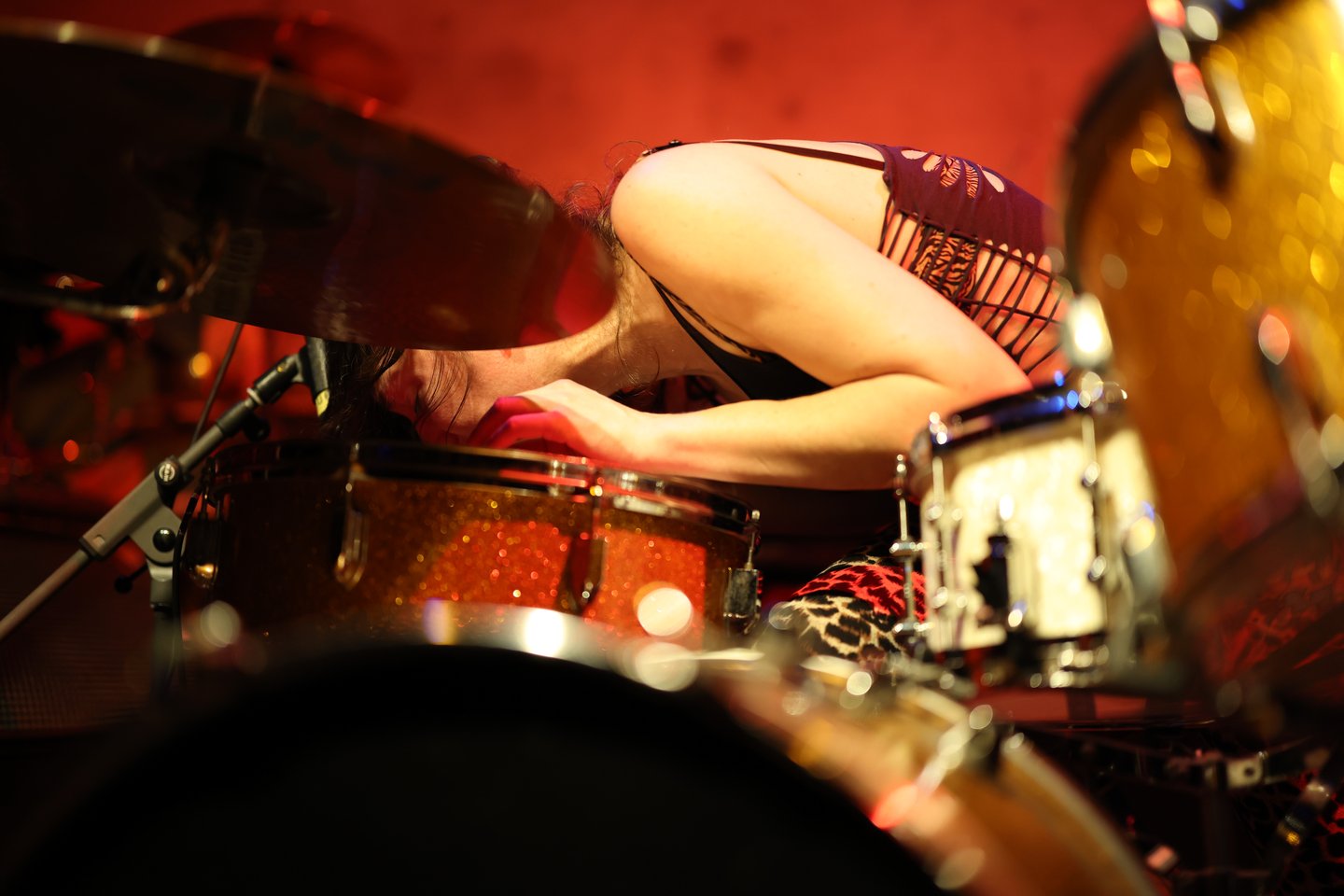 She has developed her very unique style of convulsive percussion, that she accompanies with the eclectic use of her fragmented voice, spontaneously reciting bribes of the living memory of humankind.